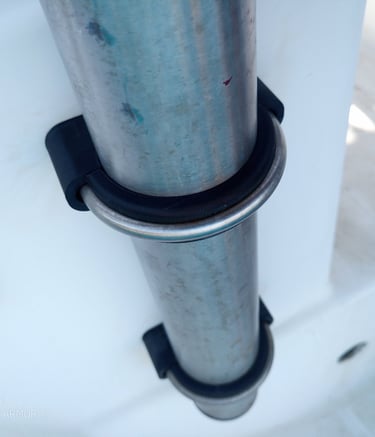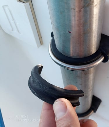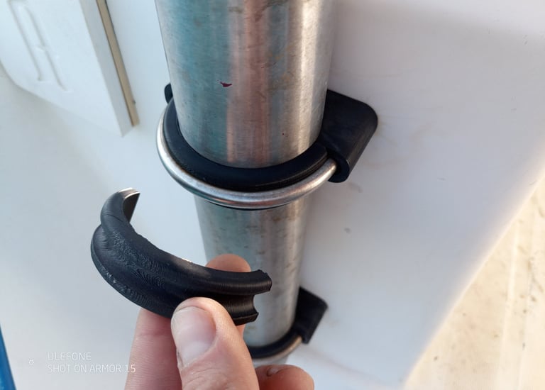 To mount 65mm inox davits on the stern of a 1996 Gibsea, I designed U-bracket supports to create a few mm distance between the polyester and the inox and increasing the contact surface between the bracket and the tube. I printed in very tough 68D shore hardness rubber. The tube is now 360° enclosed by the support, creating enough friction for secure mounting.