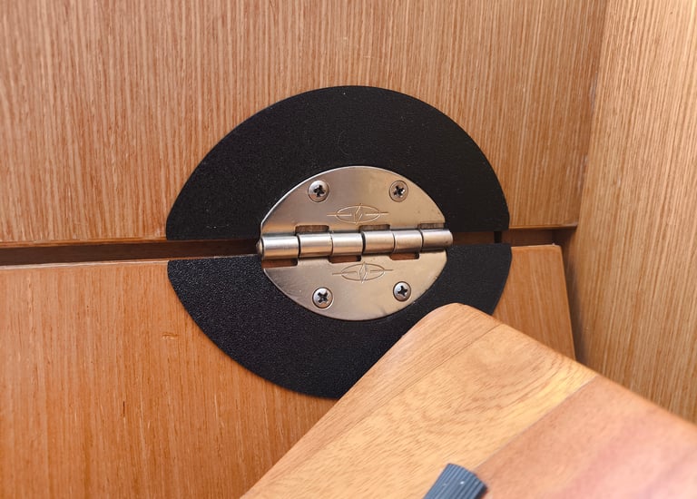 How annoying it is, that even on new yachts, the wood around the engine hatch hinges gets eroded within just a few years. Looks terrible, how can this yacht be just 4 years old?? And how to solve this problem without spending hundreds of Euros?