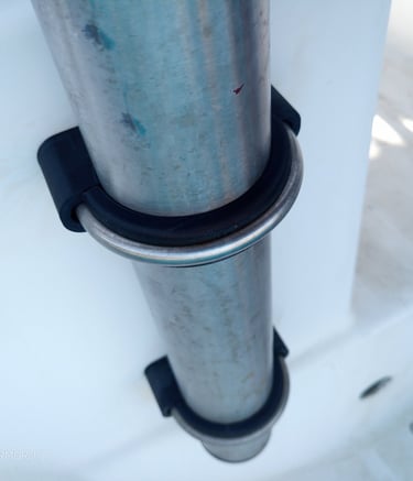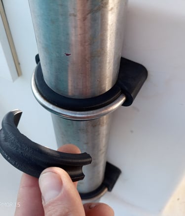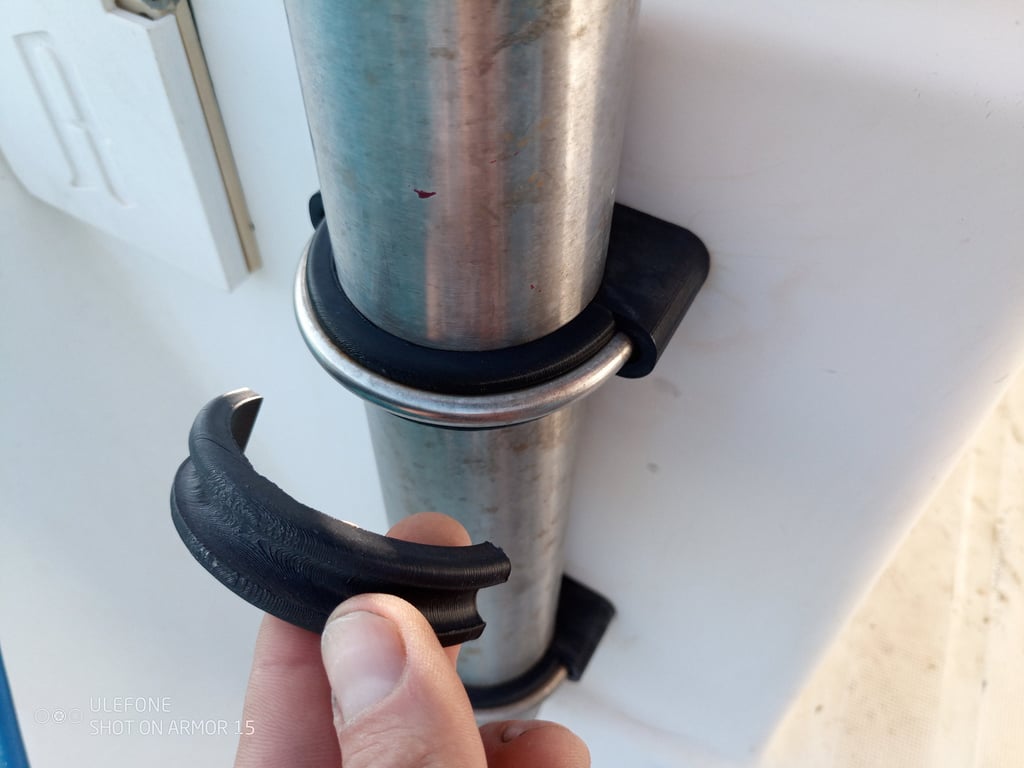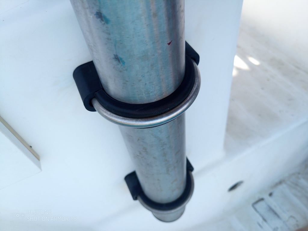To mount 65mm inox davits on the stern of a 1996 Gibsea, I designed U-bracket supports to create a few mm distance between the polyester and the inox and increasing the contact surface between the bracket and the tube. I printed in very tough 68D shore hardness rubber. The tube is now 360° enclosed by the support, creating enough friction for secure mounting.