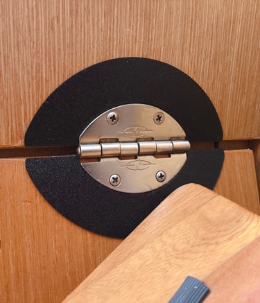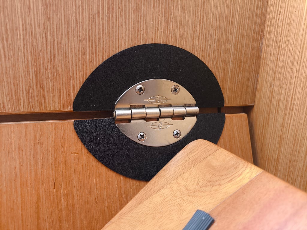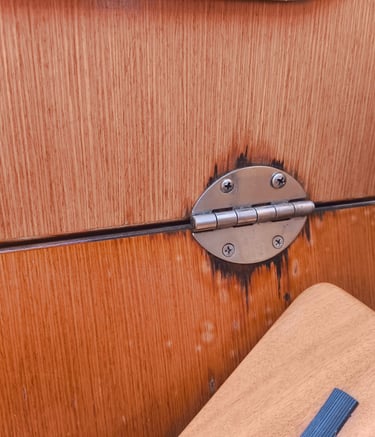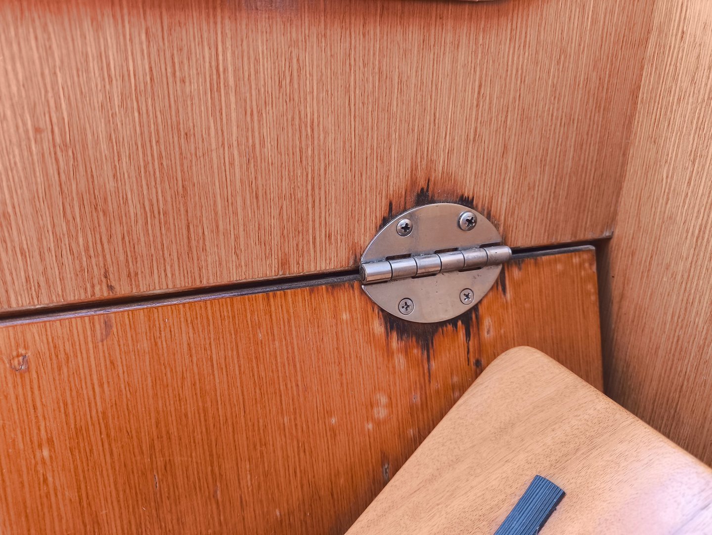 How annoying it is, that even on new yachts, the wood around the engine hatch hinges gets eroded within just a few years. Looks terrible, how can this yacht be just 4 years old?? And how to solve this problem without spending hundreds of Euros?